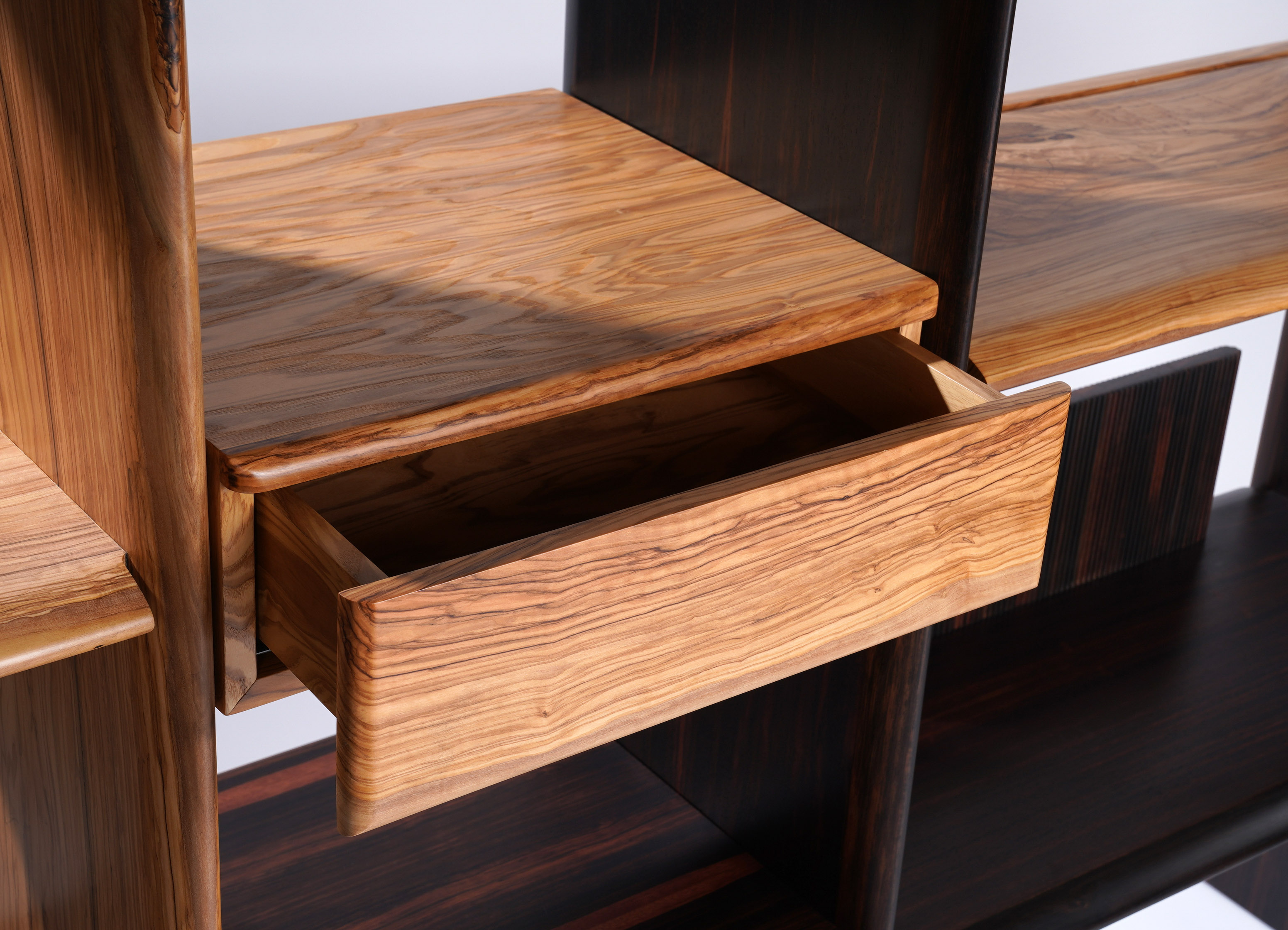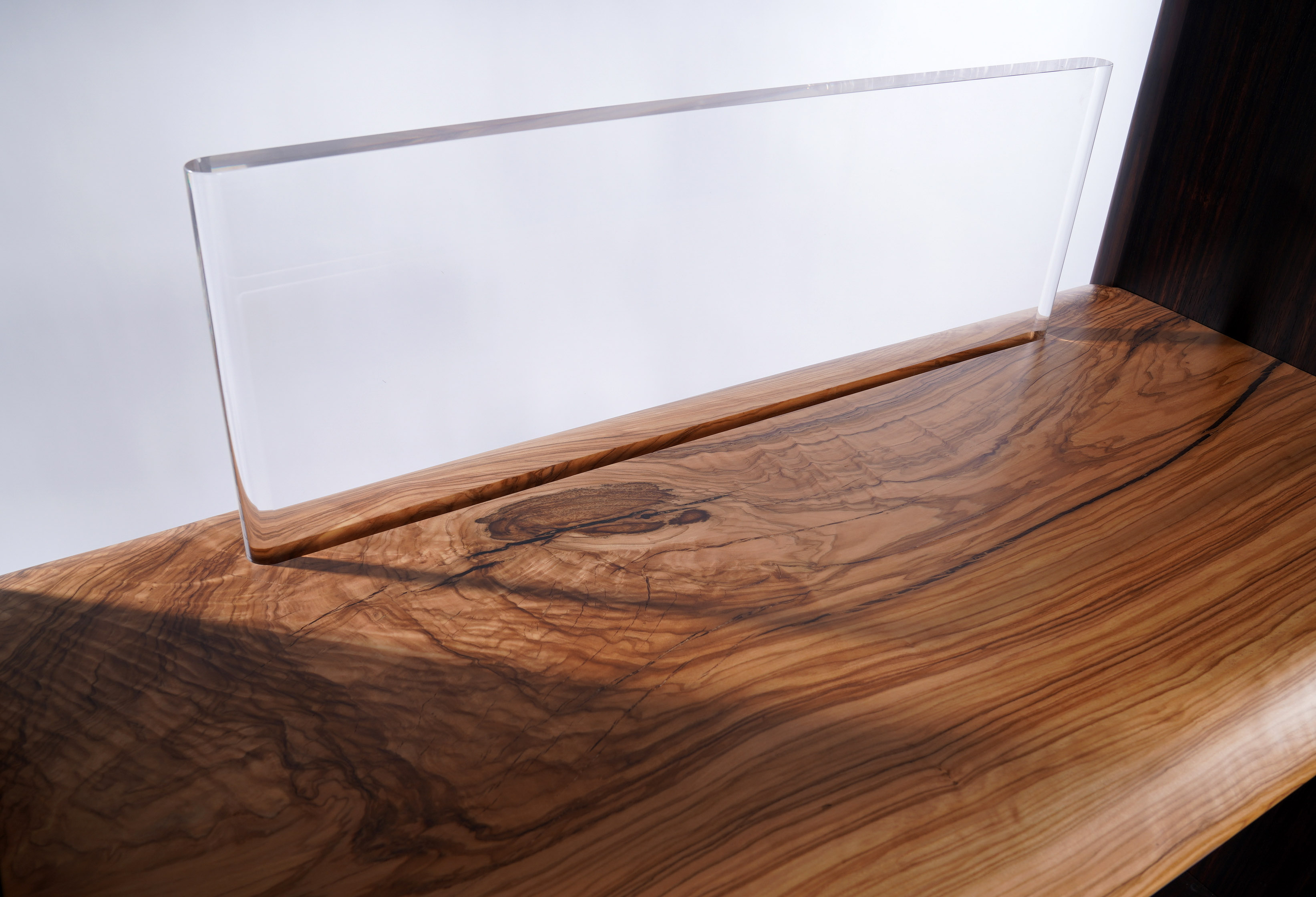 茶柜基于简洁的形态,以板材之间横竖的穿插展开设计;茶柜由多种材质、多种元素 和多个部件组合而成,以意大利橄榄木、印尼条纹乌木、亚克力为主材,自然地组合在一起, 并用金属进行局部细节的点缀。